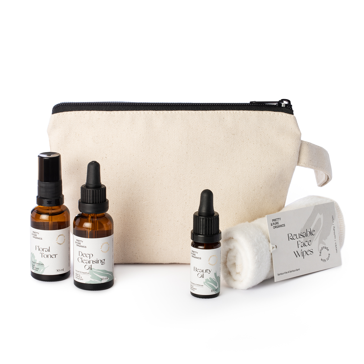 The Pretty & Pure Face Care Essentials in a simple beauty case made of organic cotton. Ideal for getting to know our products and the Pretty & Pure care ritual but also practical for on the go.